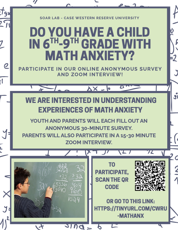 Does your child struggle with math anxiety? We are looking for children with math anxiety in 6th-9th grade and one parent/guardian to take our online, anonymous survey! To participate, please fill out this form and we will contact you: https://tinyurl.com/cwru-mathanx. Email us at soarlab@case.edu for more information.